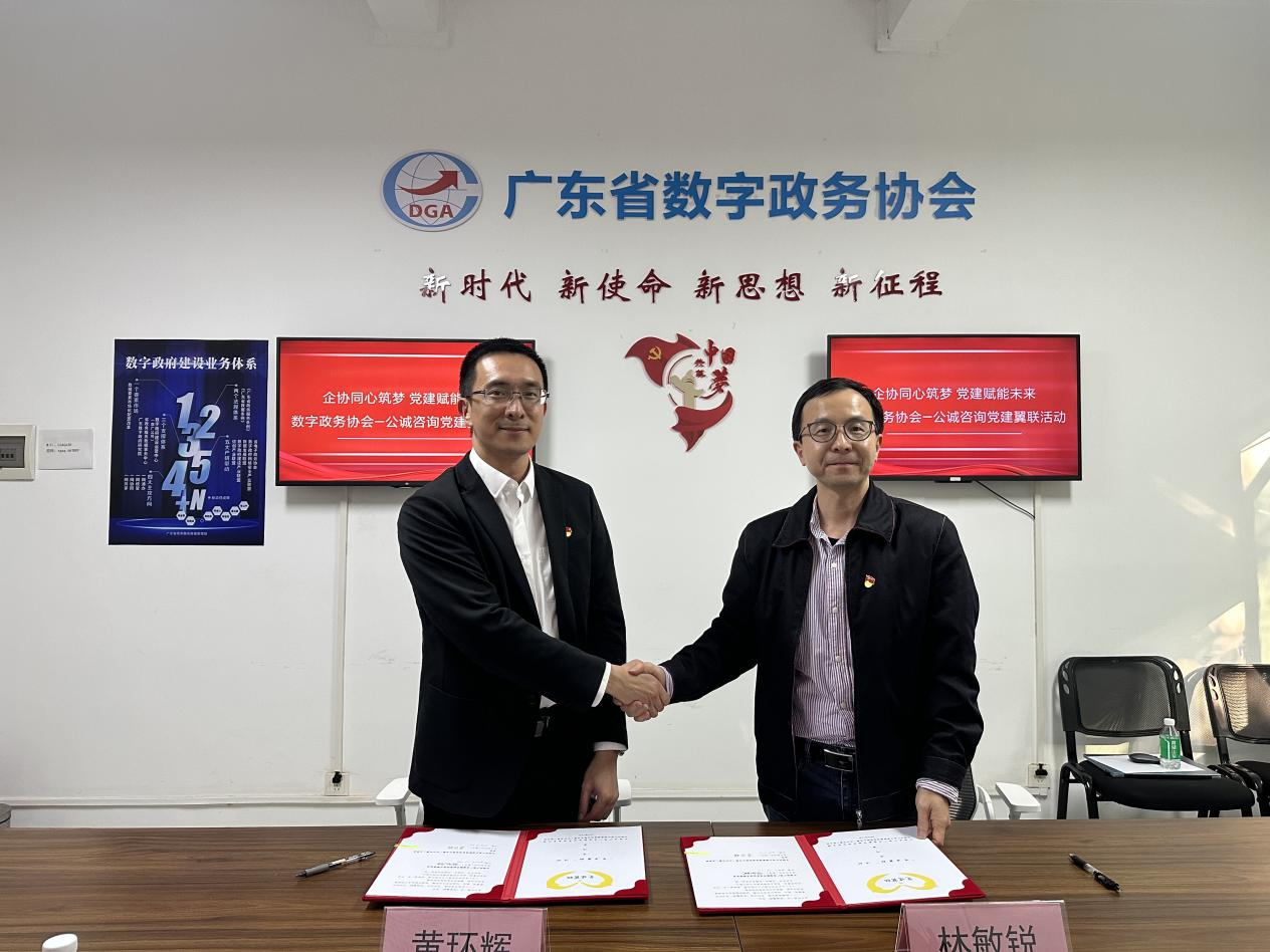 2025年12月22日,广东省数字政务协会与公诚管理咨询有限公司在“企协同心筑梦 党建赋能未来 数字政务协会—公诚咨询党建翼联活动”中正式签署“党建翼联”活动合作书。签约仪式由公诚管理咨询有限公司第一分公司第二党支部书记黄环辉与广东省数字政务协会党支部副书记林敏锐代表双方签署,并就推动合作落实展开深入交流。
