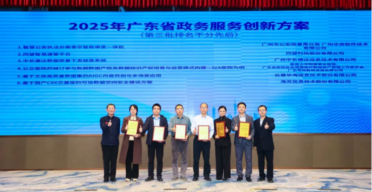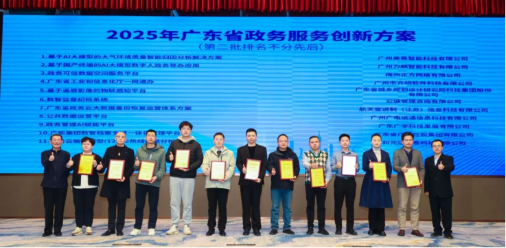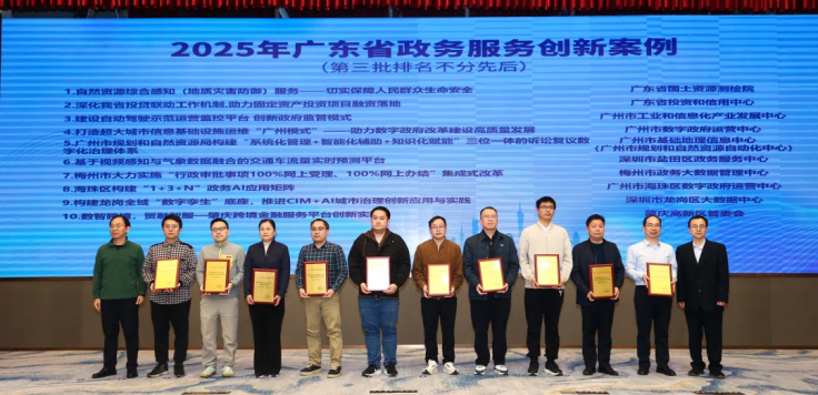 省数字政务协会副会长杜劲松、秘书长林敏锐为2025广东省政务服务创新案例入选单位颁发牌匾