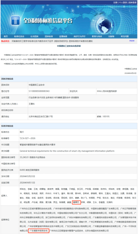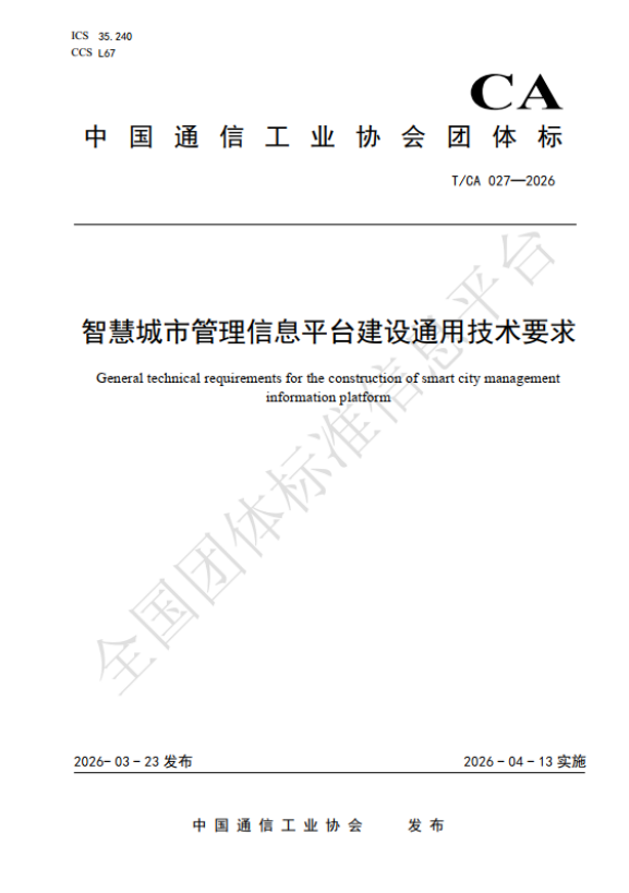 近日,广州市白云区城市管理和综合执法局(以下简称“白云区城管局”)牵头起草的T/CA 027—2026《智慧城市管理信息平台建设通用技术要求》团体标准,由中国通信工业协会在全国团体标准信息平台公开发布,于2026年4月13日起正式实施,作为智慧城市管理领域的全国团体标准,在行业内具有重要示范意义。